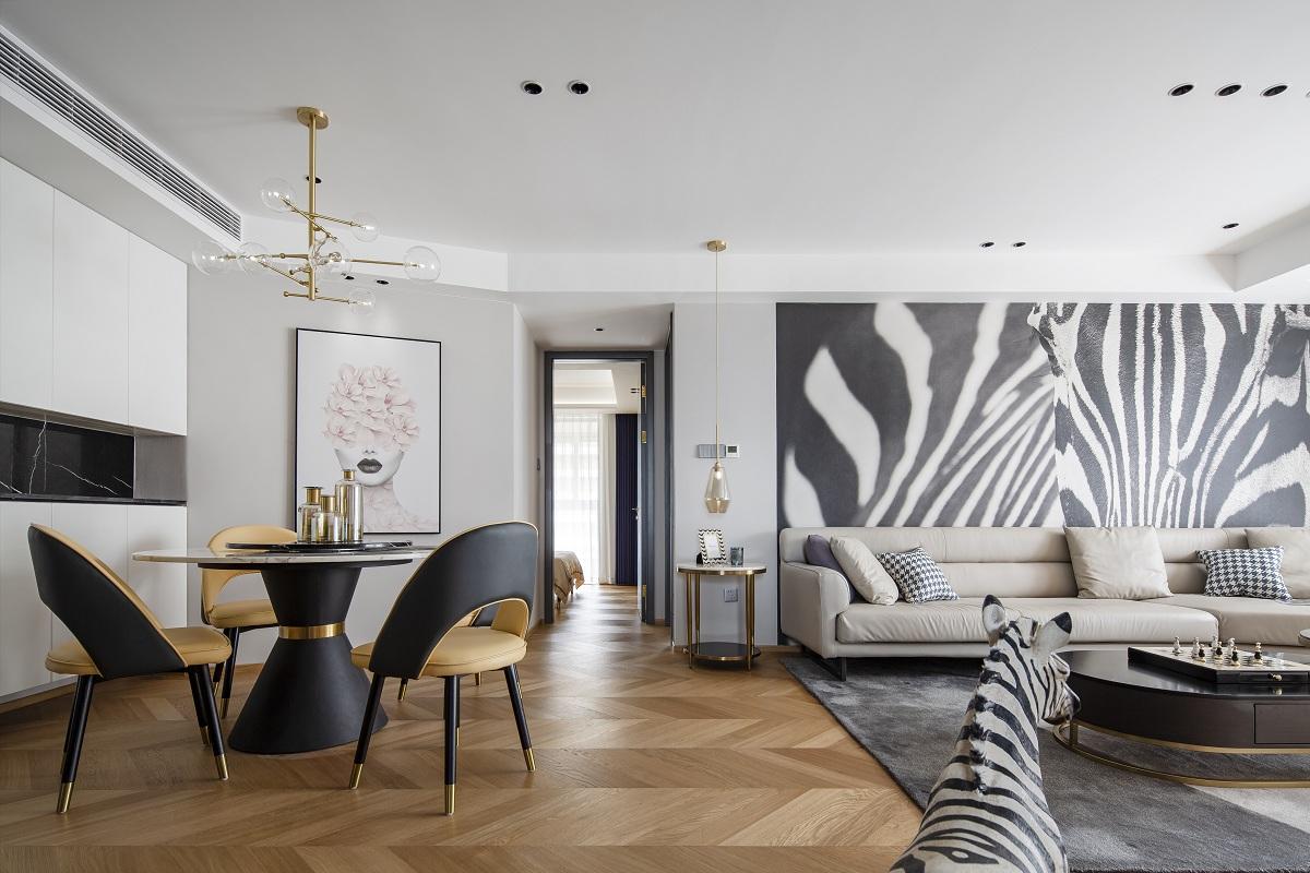桌椅和燈具采用的金屬色線條與現代黑白灰所融合,現代輕奢風表現得毫無違和感。