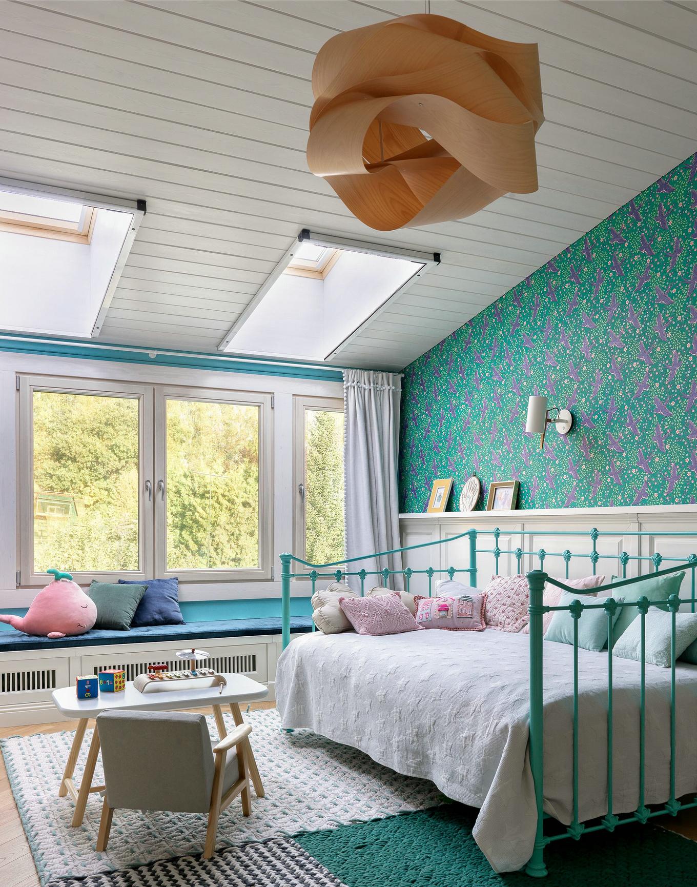 以翠綠色打底和紫色小鳥相襯托的墻紙為這間臥室營造出極繁主義的裝飾果,純白色天花板和原木色現代燈具又為其增添了幾分北歐風情。