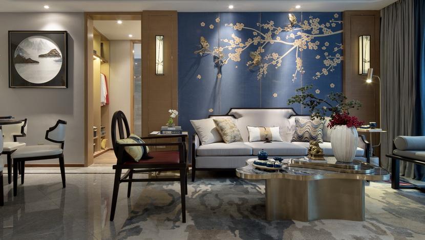 以梅花為元素主題設計的背景墻,簡素淡雅,加以三五只鳥的點綴,打造獨具東方氣韻的居住空間和內心歸宿。