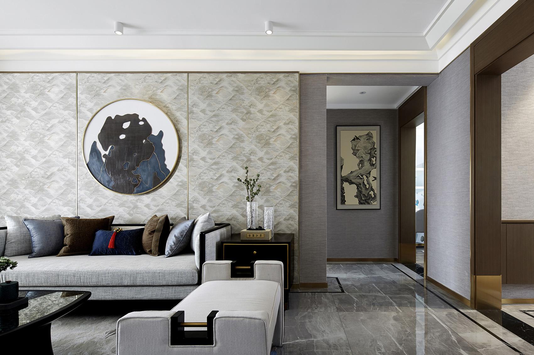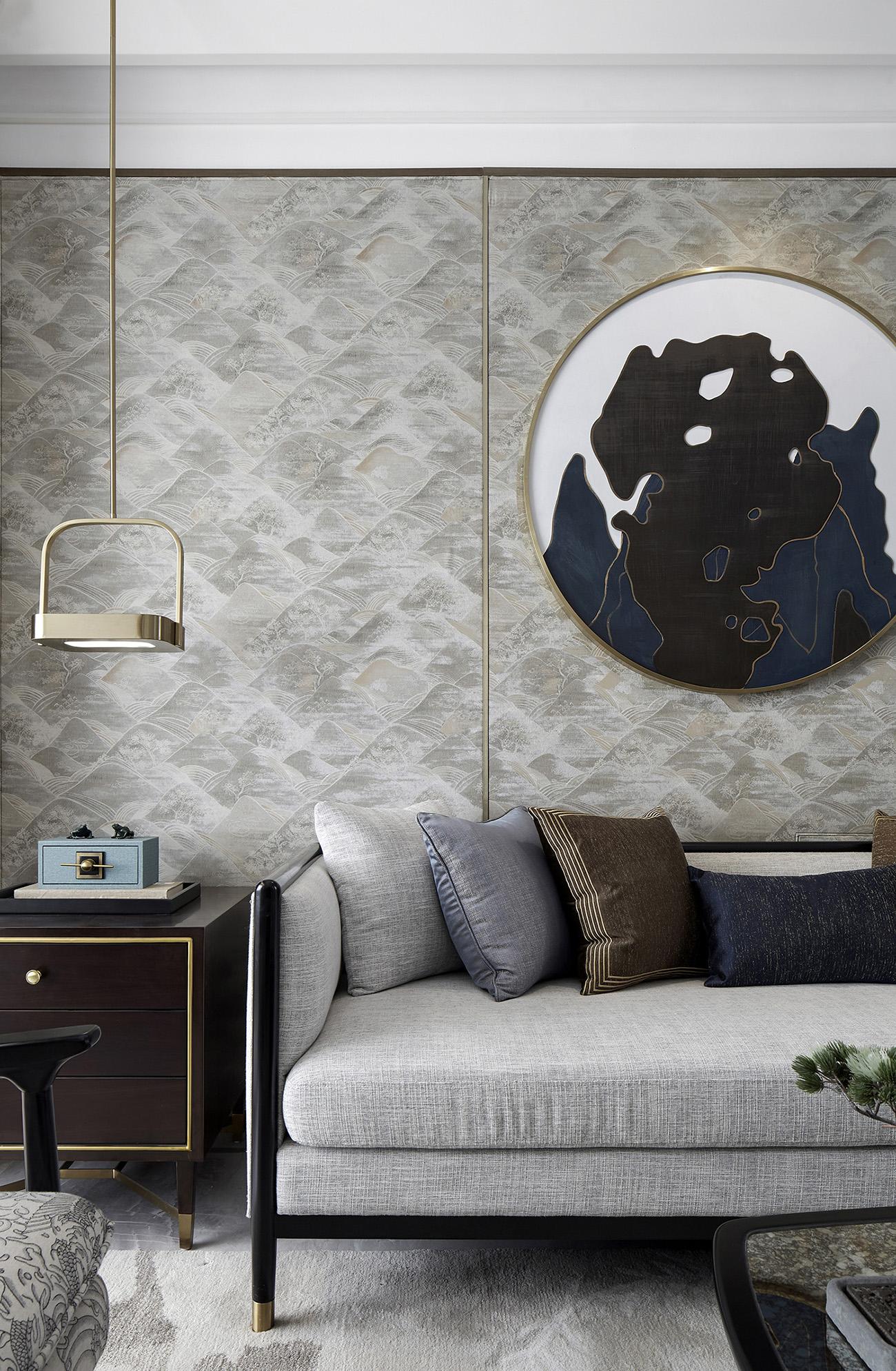 這江山如畫的墻紙在樣式上淡雅但又不失大氣,鑲嵌的金屬色邊條,時代氣息的雍容感油然而生。