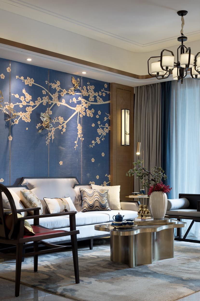 大面積的藍色背景墻猶如藍天下的梅花清新而淡雅,線條勾勒恰到好處,既不孤靜也不濃烈。
