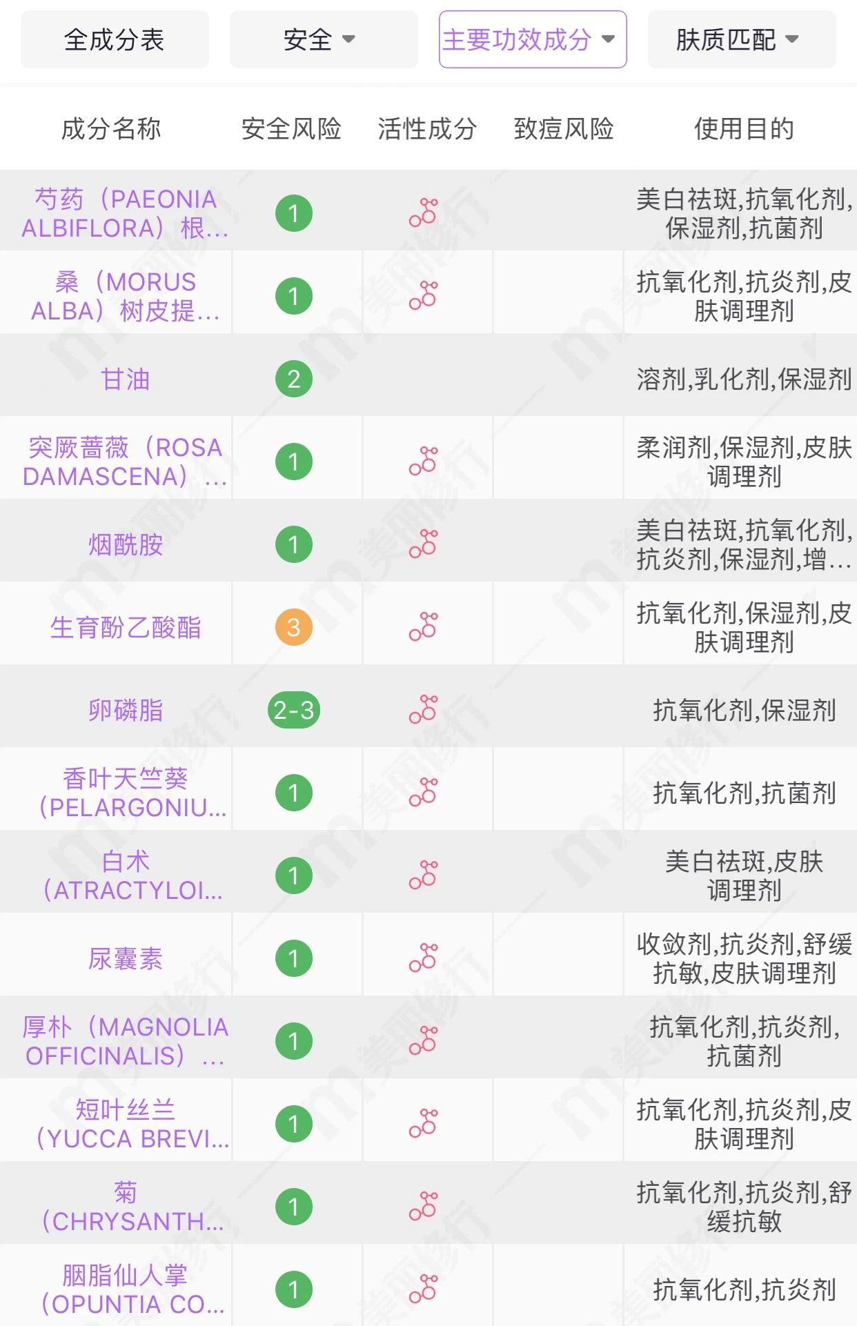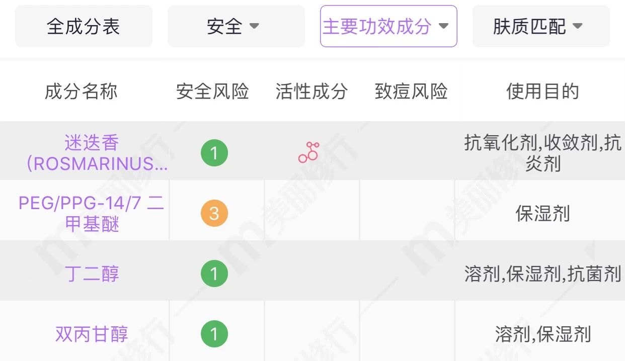 其中糖類水解物、根提取物、西班牙尾草、草籽提取物可以充分為肌膚護(hù)膚補(bǔ)水,對干皮和油皮特別友好。