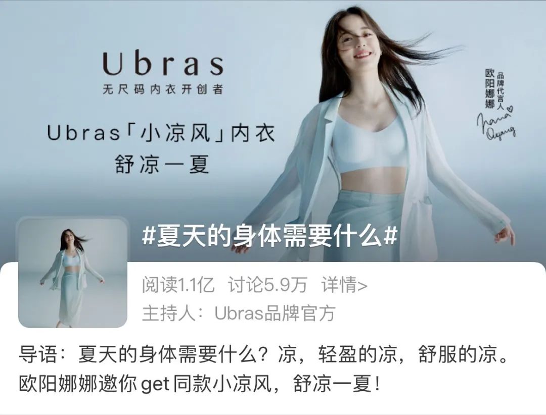與產(chǎn)品線并行的,還有Ubras對(duì)新生代女性用戶的情感投資。2019年,Ubras邀請(qǐng)歐陽(yáng)娜娜作為品牌的代言人,借助她的影響力,搭建與年輕用戶的溝通平臺(tái),傳遞“內(nèi)衣要以舒適為主”的情感共鳴。