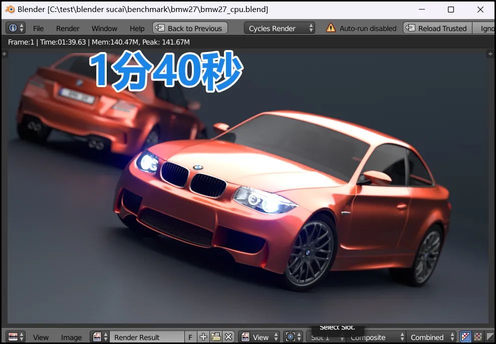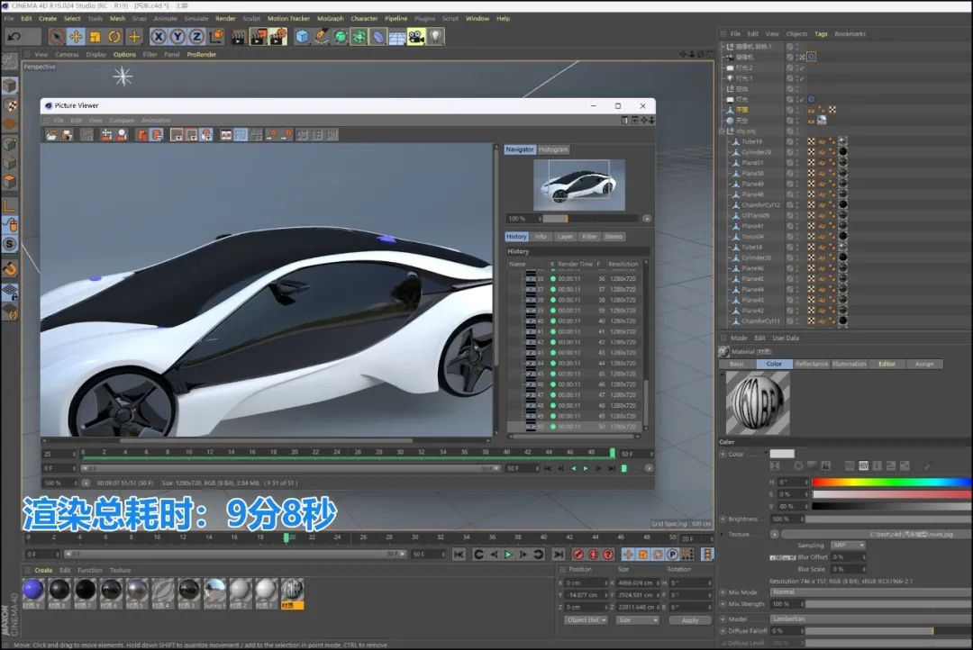 Cinema 4D是大家熟悉的基準(zhǔn)測(cè)試Cinebench的“真身”,活躍在廣告、動(dòng)畫以及游戲的設(shè)計(jì)領(lǐng)域。我們用它來渲染一個(gè)汽車旋轉(zhuǎn)的動(dòng)畫,每秒25幀畫面。為了控制總體耗時(shí)(不要太長(zhǎng)),我們僅渲染2秒動(dòng)畫,加上首尾幀,共計(jì)51幀畫面,來看總體耗時(shí)情況。