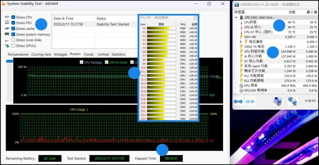 ▲在ROG奧創(chuàng)智控中心里選擇“手動(dòng)”模式,并在CPU標(biāo)簽中將風(fēng)扇拉到全速以發(fā)揮處理器的強(qiáng)性能,此時(shí)i9 13980HX的爆發(fā)功率可達(dá)175W,而穩(wěn)定輸出功率在135W附近。室溫18℃,默認(rèn)勾選Aida 64前四項(xiàng)(符合實(shí)際應(yīng)用形態(tài)),考機(jī)30分鐘+,i9 13980HX封裝功率在133W~135W微幅波動(dòng),其中P核不同核心頻率在4GHz~4.4GHz振動(dòng),而E核頻率則在3.4GHz~3.6GHz微幅振動(dòng),總體頻率保持得相當(dāng)不錯(cuò)。處理器內(nèi)部溫度為90℃~96℃。