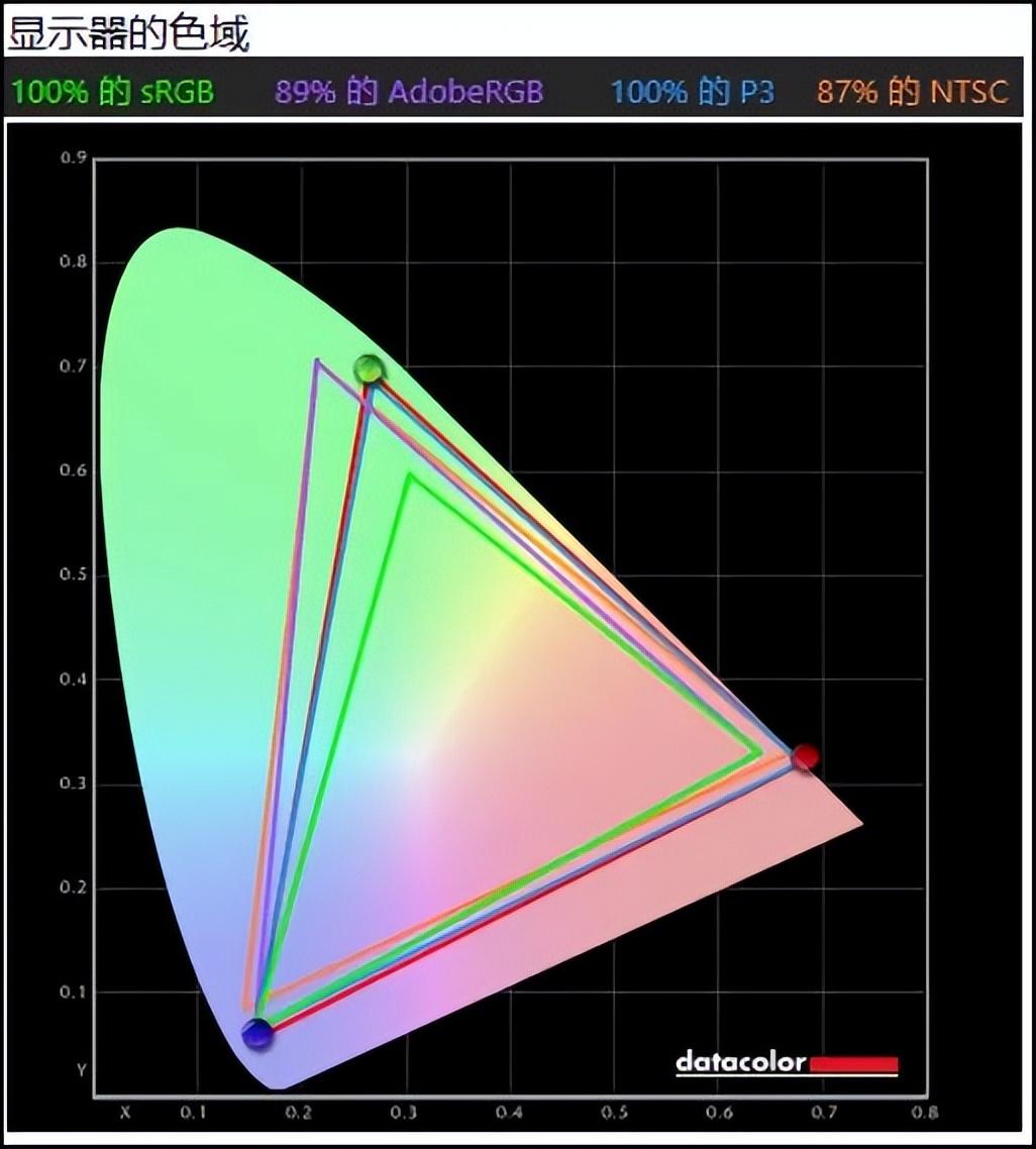 ▲色域情況,sRGB和DCI-P3色域都沖上了,AdobeRGB為89%,NTSC為87%,總體不俗。