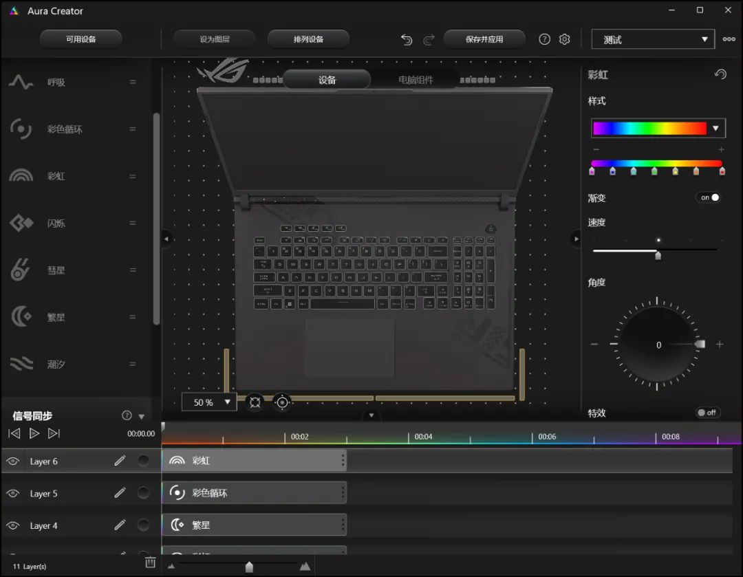 ▲不過奧創(chuàng)智控中心只有預(yù)設(shè)燈效,要實(shí)現(xiàn)單鍵多彩背光,需進(jìn)入Aura Creator選擇按鍵(或區(qū)域)并創(chuàng)建圖層后添加效果,稍顯費(fèi)勁兒。