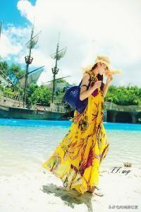 黃色印花連衣裙搭配大草帽,夾腳涼鞋~絕美的度假LOOK。
