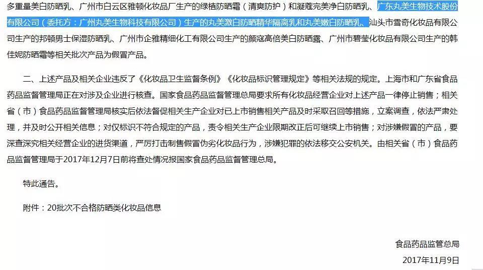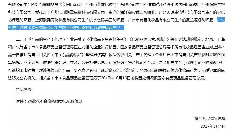 2017年9月,食品藥品監(jiān)督管理總局發(fā)布了“關(guān)于24批次防曬類化妝品不合格”的通告,其中丸美股份不幸名列其中,春紀(jì)美白防曬乳被指出涉嫌假冒產(chǎn)品。