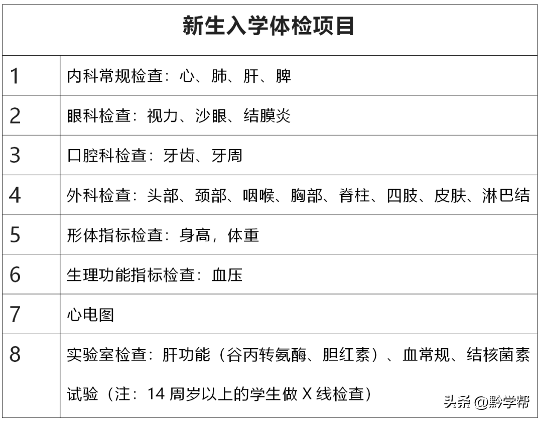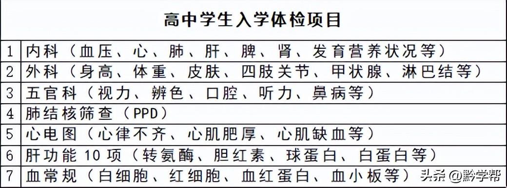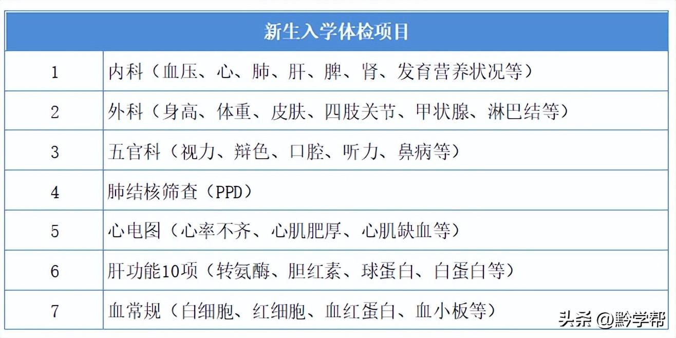 在入學報到前須按照貴州省衛(wèi)生部門的要求自行前往縣級以上的醫(yī)院進行入學前的身體體檢,體檢項目為: