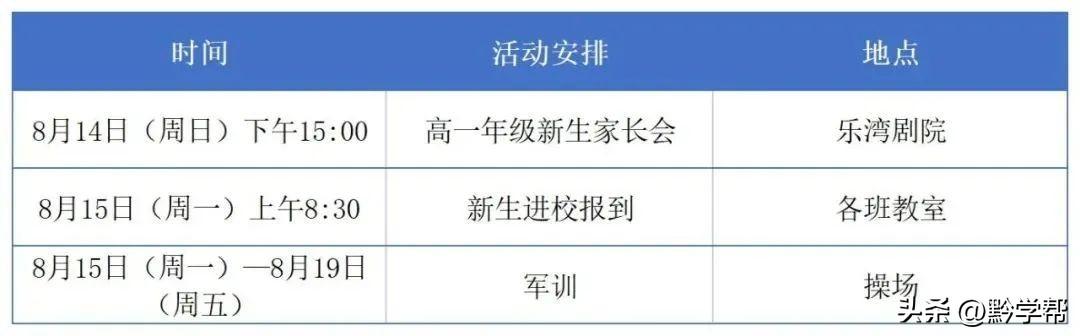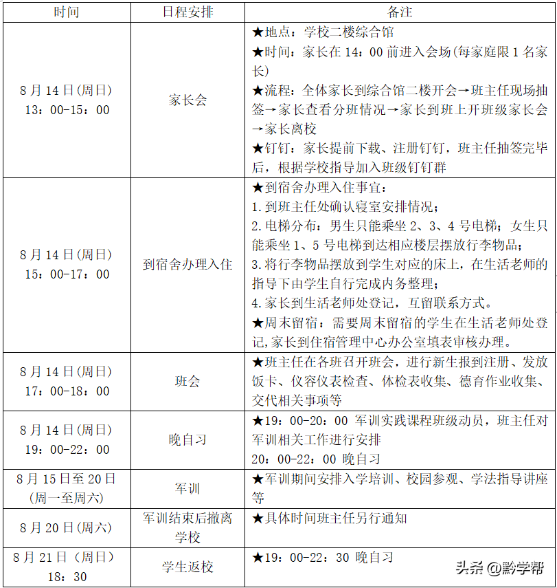 8月14日至20日軍訓,軍訓結(jié)束學生返家。8月21日下午6點前返校,8月22日正式上課。