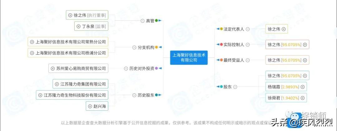 根據(jù)企查查APP數(shù)據(jù)顯示,上海聚好信息技術(shù)有限公司成立于2012年7月31日,大股東法人徐之偉持股約95%,值得注意的是,徐之偉亦是江蘇隆力奇集團(tuán)有限公司法人、大股東、董事長(zhǎng)。