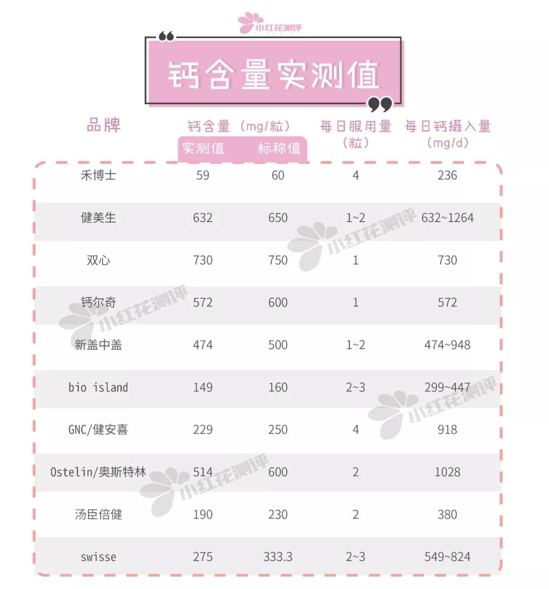 需要說明的是,由于維D并非10款產(chǎn)品都含有的成分,并且補(bǔ)鈣劑的主要成分還是鈣含量,維D亦可以從其他途徑攝入,為了公平起見,小紅花測評沒有將維D含量作為賦分項(xiàng)之一。