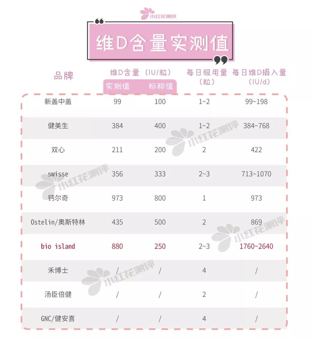 維D含量實(shí)測:bio island實(shí)測值多兩倍