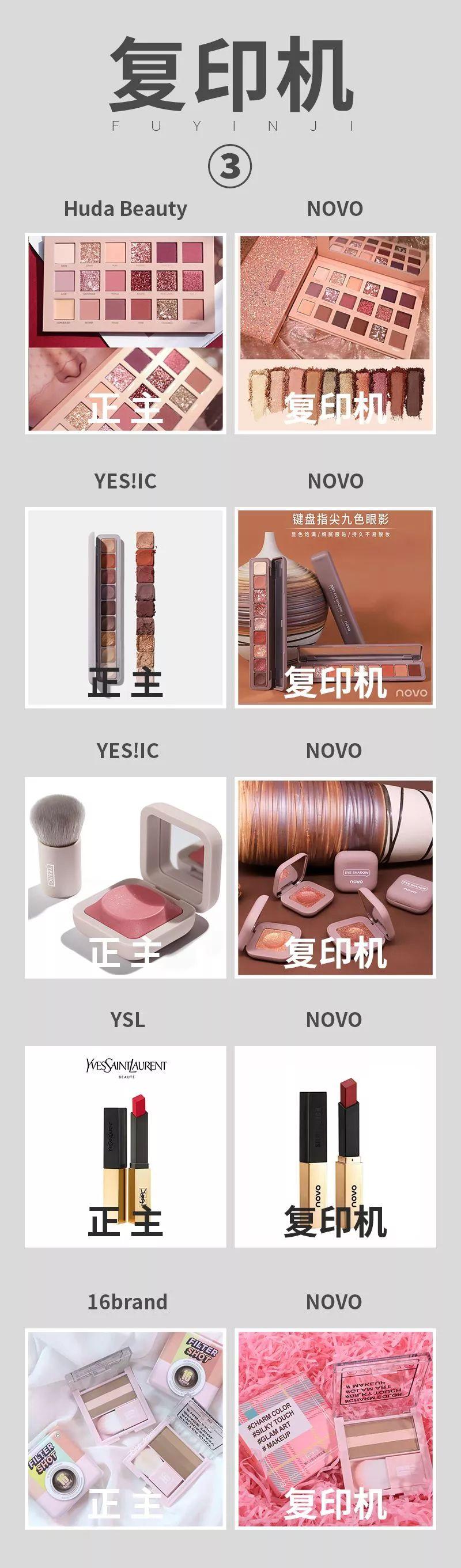 彩妝品牌NOVO的產(chǎn)品看起來眼熟度也是高達(dá)90%,而且它是無差別攻擊,不管是國外,還是韓國小眾品牌,還是國內(nèi)新銳品牌,只要是它看上的,統(tǒng)統(tǒng)都不放過。
