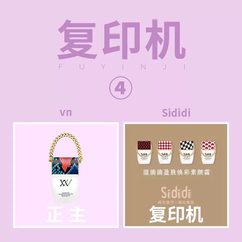除了上述所說的“全復(fù)印”和“90%復(fù)印”,還有更多的品牌是在出單品的時(shí)候“小抄”一下,比如Sididi這個(gè)品牌,據(jù)企查查信息是今年6月剛成立的一個(gè)品牌,剛成立就開始抄?是把抄襲作為核心能力嗎?被抄襲的韓國VN鉑金包防曬霜今年上半年可火了很久了,蹭熱點(diǎn)也不是這么蹭的吧。