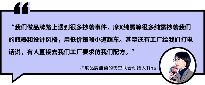 “只要中國市場還在大幅增長,這些抄襲者的空間就很大,345678線城市的消費(fèi)者并不在意這些。直到消費(fèi)者回歸真正的理性,回到對(duì)產(chǎn)品內(nèi)核的認(rèn)可和品牌內(nèi)核的認(rèn)可,這樣的情況才有可能改變?!彪r菊的天空聯(lián)合創(chuàng)始人Tina說道。
