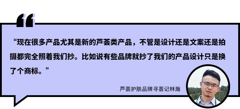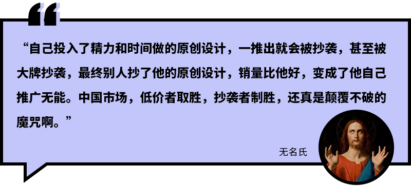 這些坐享其成的抄襲者,輕而易舉地就能摧毀新銳品牌辛苦建起的國貨好形象。而那些花大心血設(shè)計(jì)自己的產(chǎn)品的創(chuàng)始人們,遇到被抄襲的情況也是心酸又無奈。