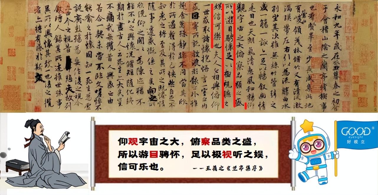 《蘭亭集序》是中國文明或者中國文化里面特別重要的一個文本,王羲之又是一個大書法家,這句古文的釋意為,仰首觀覽到宇宙的浩大,俯看觀察大地上眾多的萬物,用來舒展眼力,開闊胸懷,足夠來極盡視聽的歡娛,實在很快樂。