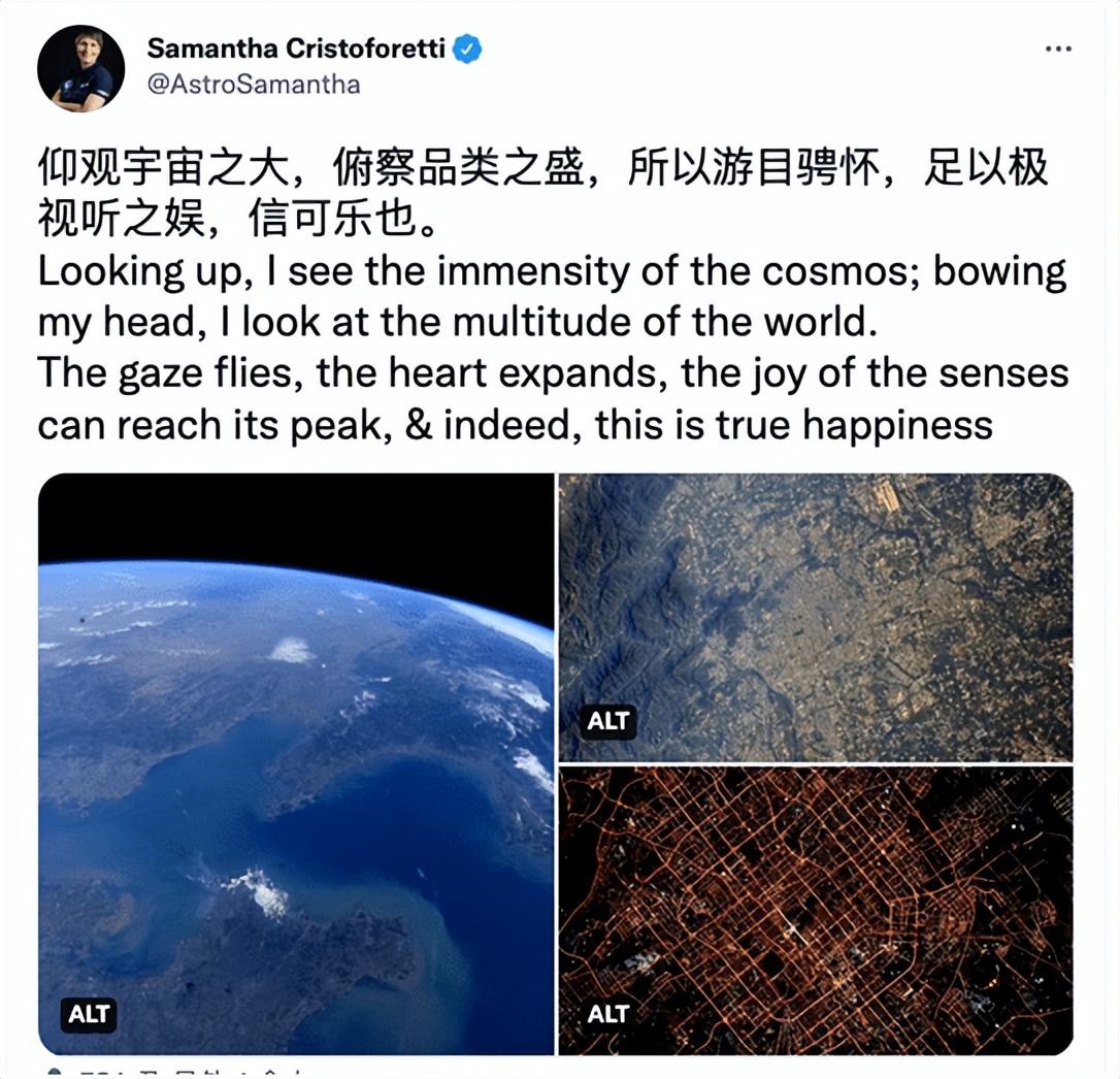 近日,在國際空間站執(zhí)行任務(wù)的意大利女宇航員薩曼薩·克里斯托福雷蒂在社交媒體上發(fā)布了一組太空攝影作品,并配上了中國書法家王羲之所著《蘭亭集序》中一句描繪宇宙景觀的古文——“仰觀宇宙之大,俯察品類之盛,所以游目騁懷,足以極視聽之娛,信可樂也”。此舉引發(fā)國內(nèi)外網(wǎng)友熱議。