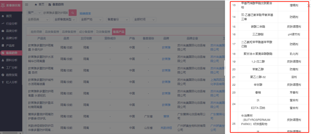美業(yè)顏究院數(shù)據(jù)系統(tǒng)顯示,這款防曬噴霧的代工廠是一家主營個(gè)人護(hù)理品、家庭用品以及消毒劑類產(chǎn)品的公司,與此同時(shí),產(chǎn)品于去年11月份就通過了備案。