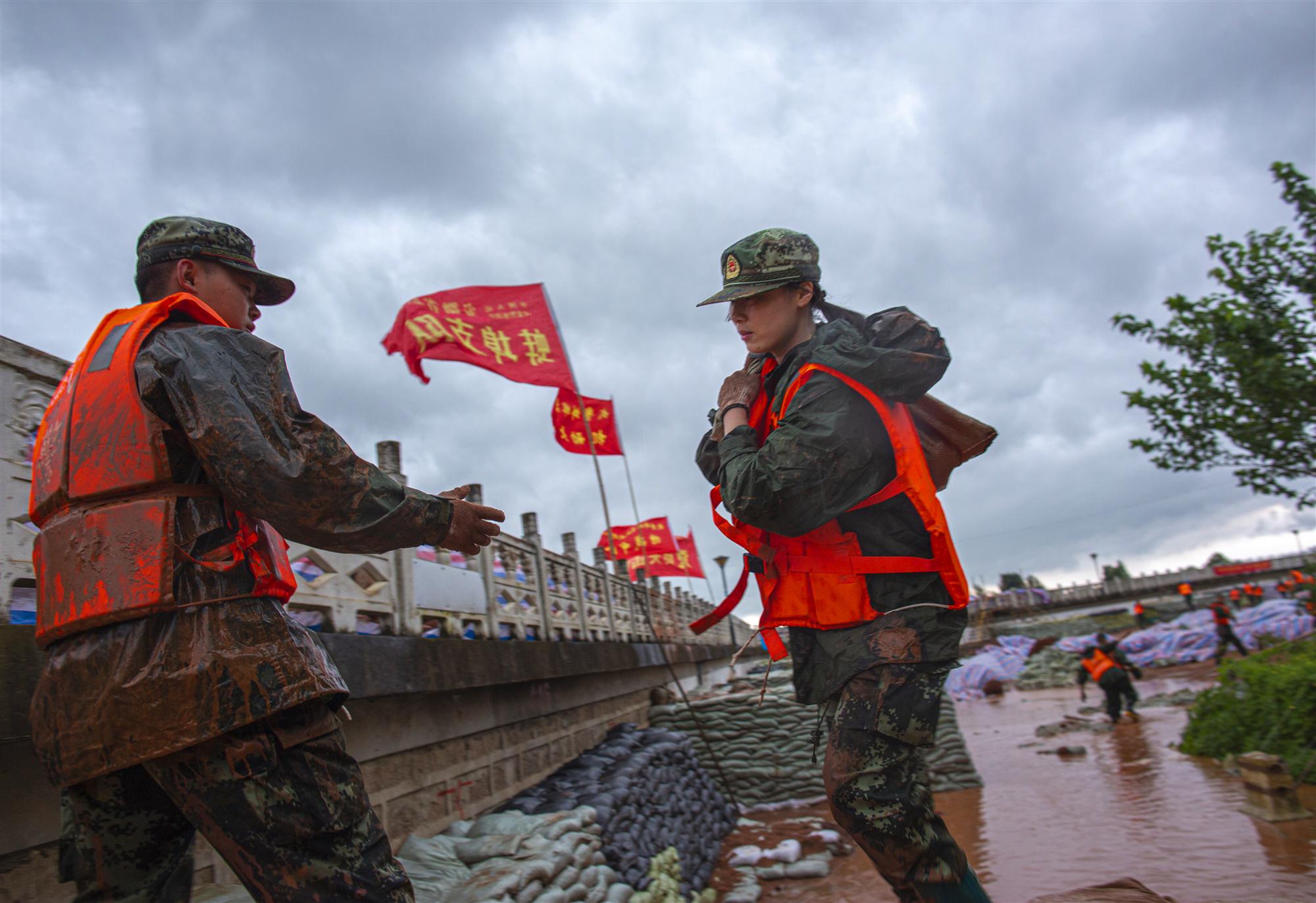 7月20日,樅陽(yáng)縣持續(xù)大暴雨,長(zhǎng)河水位直逼壩頂,防汛抗洪壓力增大?!岸嗫敢粋€(gè)沙袋,就有可能多一份勝機(jī)!”張璐明卸下軍醫(yī)背囊,直奔?jí)雾斂钙鹆松嘲?。?jīng)過(guò)6小時(shí)的戰(zhàn)斗,官兵們加高加固防洪墻近千米,圓滿完成任務(wù)。