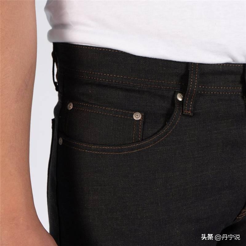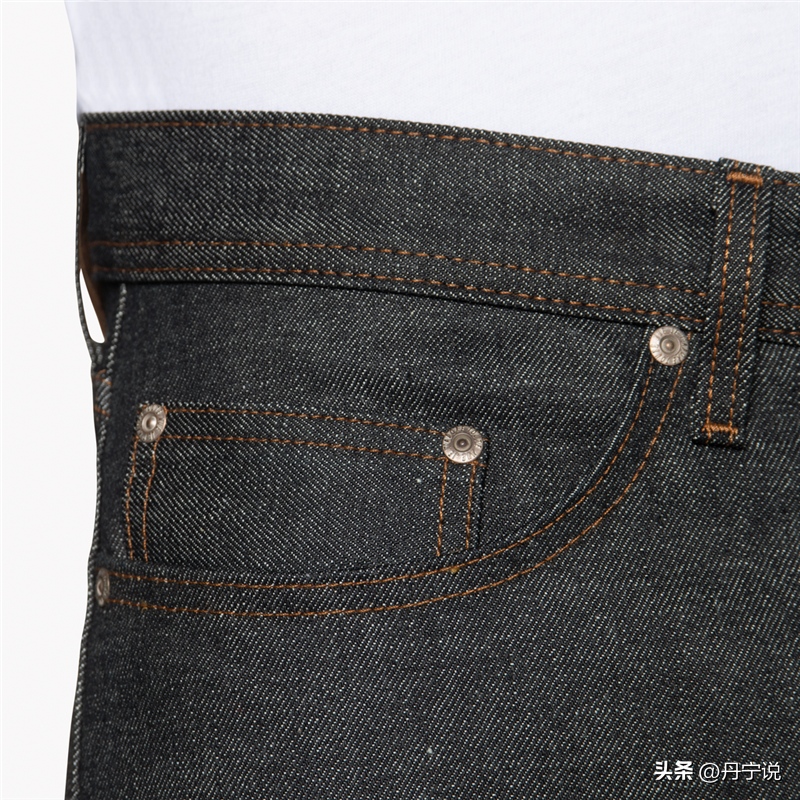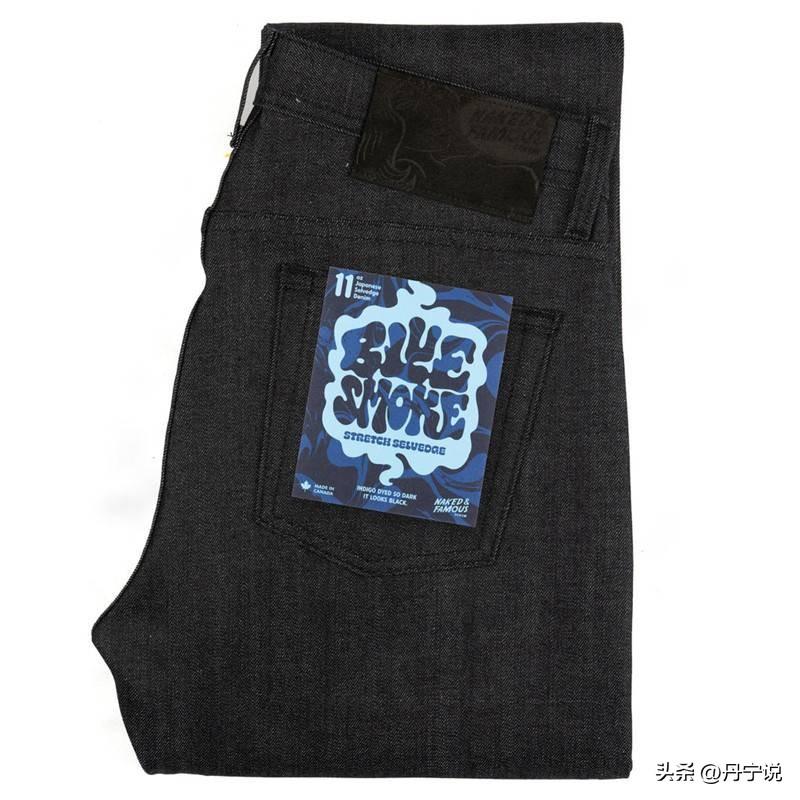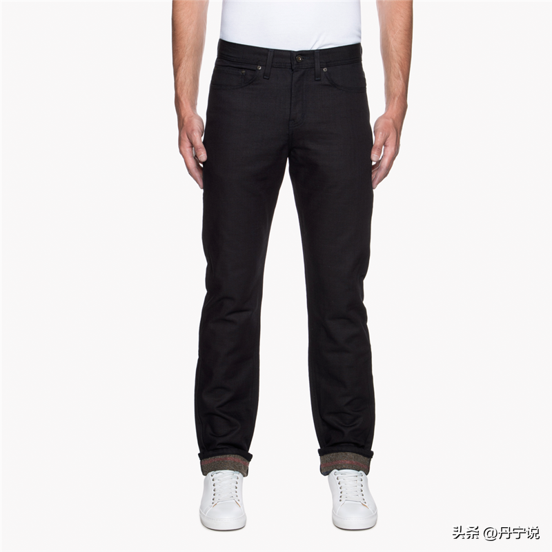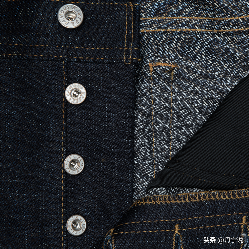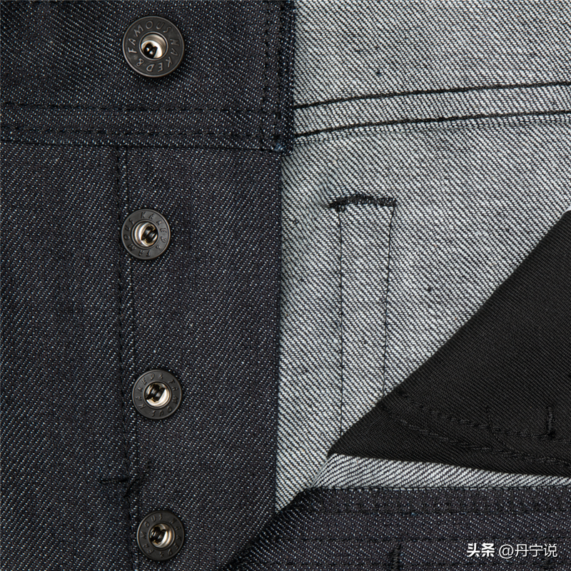 第四款:Blue Smoke 11oz藍(lán)煙彈力牛仔褲Blue Smoke Stretch Selvedge是一款11盎司的日本彈力赤耳牛仔褲。相比上一款,磅數(shù)輕一些,帶藍(lán)耳。但是顏色很深,看起來(lái)是黑色的,但實(shí)際上是靛藍(lán)染色的。其中的秘訣是在染料中添加一點(diǎn)黑色,使這種面料具有獨(dú)特的煙熏色。這里可以通過(guò)斜紋線看到白色緯紗。這款牛仔褲添加2%的彈力纖維,會(huì)增加了一定舒適度,外觀清爽硬朗又不影響耐用性。采用黑色縫線、黑色絨面革貼片和軍用規(guī)格非反光黑色金屬紐扣和鉚釘。