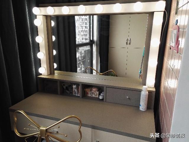 主臥的一大改造就是把陽臺封起來,擴大了主臥的面積,一側(cè)做成衣柜放女生衣服,一側(cè)做成梳妝臺,變成了一個衣帽間。為了做出心中的化妝臺,在宜家沒有看到合適的,后還是在淘寶定制了燈飾滿意。