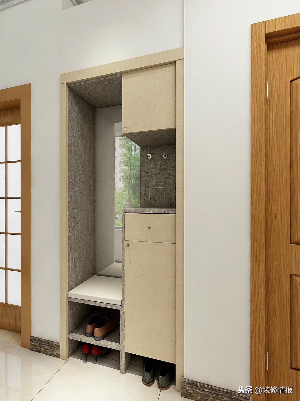 兩個鞋柜中間的抽屜用來放雨傘、防曬霜、帽子等一些出門用品,桌面和掛鉤用來放鑰匙等常用物品,上層柜子用來放健身器材和體育用品還有配電箱。