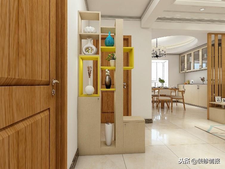 由于家里長輩說進門走廊不要直接對著房門,所以設(shè)計了一個玄關(guān),左右下方兩個小柜的反面設(shè)計了假門,也裝了把手以便美觀,放了火災逃生用品,天花板感應自動滅火裝置必須要消防系統(tǒng)才能安裝)和工具箱。本來玄關(guān)顏色打算跟所有柜體統(tǒng)一用米黃和灰色,但是設(shè)計師提出用一點檸檬黃可以更加明亮和跳躍。玄關(guān)后面設(shè)計了一個插座用于門鈴,店家還附送了一個很好用的小夜燈。