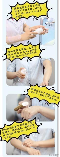 支招“首先,防曬產(chǎn)品上注明的SPF主要是防止皮膚曬紅的強(qiáng)度數(shù)值,是指防護(hù)能力的強(qiáng)弱。比如,SPF15代表可以延長(zhǎng)15倍皮膚被曬紅的時(shí)間;而PA是指防止皮膚曬黑、衰老的強(qiáng)度數(shù)值,‘+’就是預(yù)防強(qiáng)度的體現(xiàn)。”田立紅說(shuō),不同膚質(zhì)的女性要選擇不同的防曬霜。