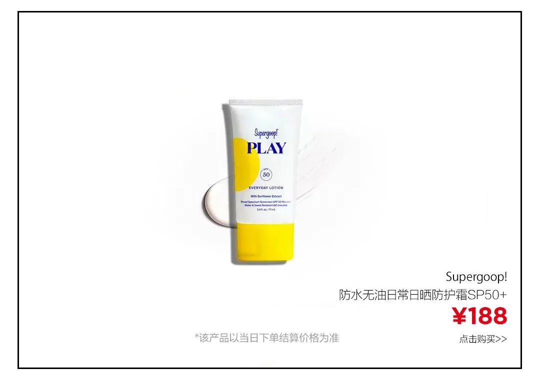 ▲莎拉波娃摯愛品牌Supergoop!在國內算是小眾品牌,也是專做防曬產品的品牌。這支防水日常日曬防護霜有SPF50 PA++++的防曬指數(shù),防水防汗。不含刺激成分,防曬的同時還能抗老抗氧化。