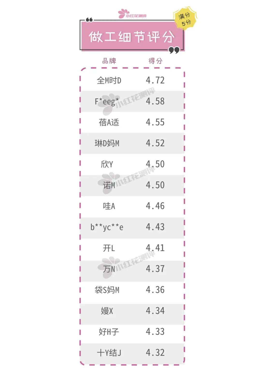 第一輪測試后,哇A、b**yc**e、F*eeg* 、琳D媽M、袋S媽M的使用性能得分在4.60分及以上,排名靠前,進入第二輪測試——送檢實驗室。