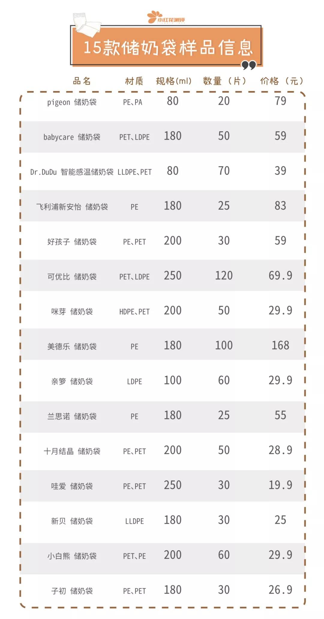 測評(píng)樣品小紅花測評(píng)根據(jù)電商平臺(tái)的銷量,選擇了以下15款儲(chǔ)奶袋進(jìn)行對(duì)比測評(píng)。所有樣品均購自各品牌官方旗艦店。