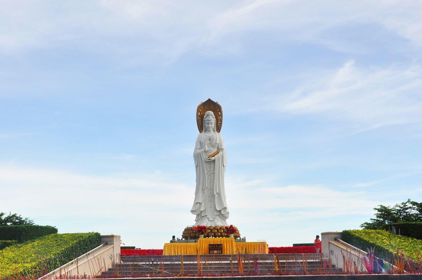 南山海上觀音·南山海上觀音圣像高108米,凌波佇立在海上金剛洲上,被譽(yù)為是“、世紀(jì)級(jí)”的佛事工程。 ·一體化三尊造型,寶相莊嚴(yán),腳踏一百零八瓣蓮花寶座,蓮花座下為金剛臺(tái),金剛臺(tái)內(nèi)是圓通寶殿。 ·金剛洲由普濟(jì)橋與陸岸相連,普濟(jì)橋另一側(cè)是觀音廣場(chǎng)及廣場(chǎng)兩側(cè)主題公園。 ·此外還充分運(yùn)用高科技手法打造燈光夜景,充分展示“佛光普照”、“踏海而來(lái)”等觀音文化藝術(shù)效果。
