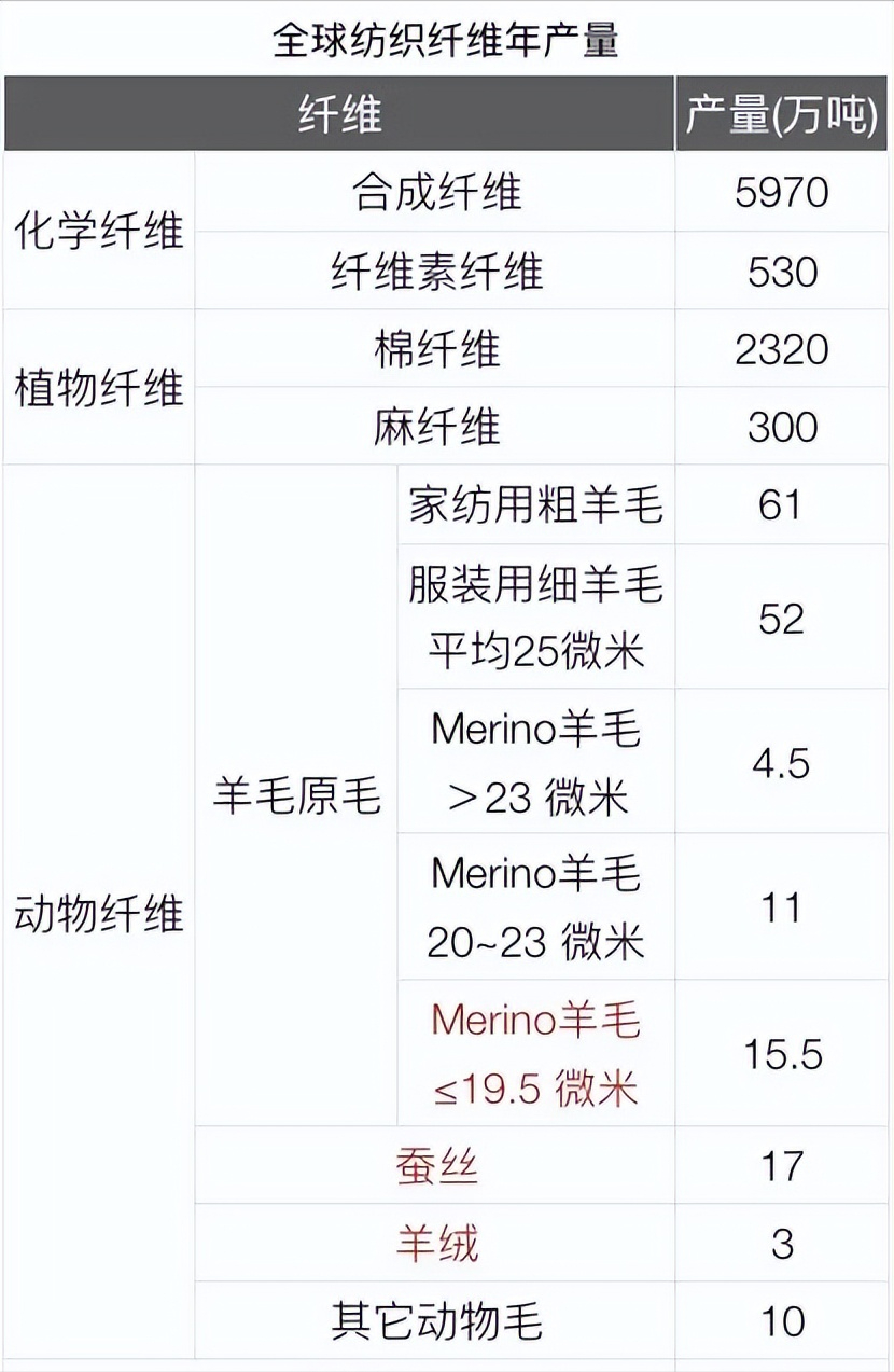 化學(xué)纖維與植物纖維產(chǎn)量為2018年數(shù)據(jù),羊毛產(chǎn)量為2021年數(shù)據(jù),蠶絲、羊絨和其它動物毛產(chǎn)量為2016年數(shù)據(jù),數(shù)據(jù)均來自中國或各國棉紡、毛紡、化纖行業(yè)協(xié)會。我查詢數(shù)據(jù)時(shí)發(fā)現(xiàn),有些機(jī)構(gòu)給出的是收購的原毛數(shù)據(jù),有些給的是凈毛,羊毛的凈毛大約是原毛的80%,羊絨的凈絨率更低。表中統(tǒng)一給出的都是原毛。