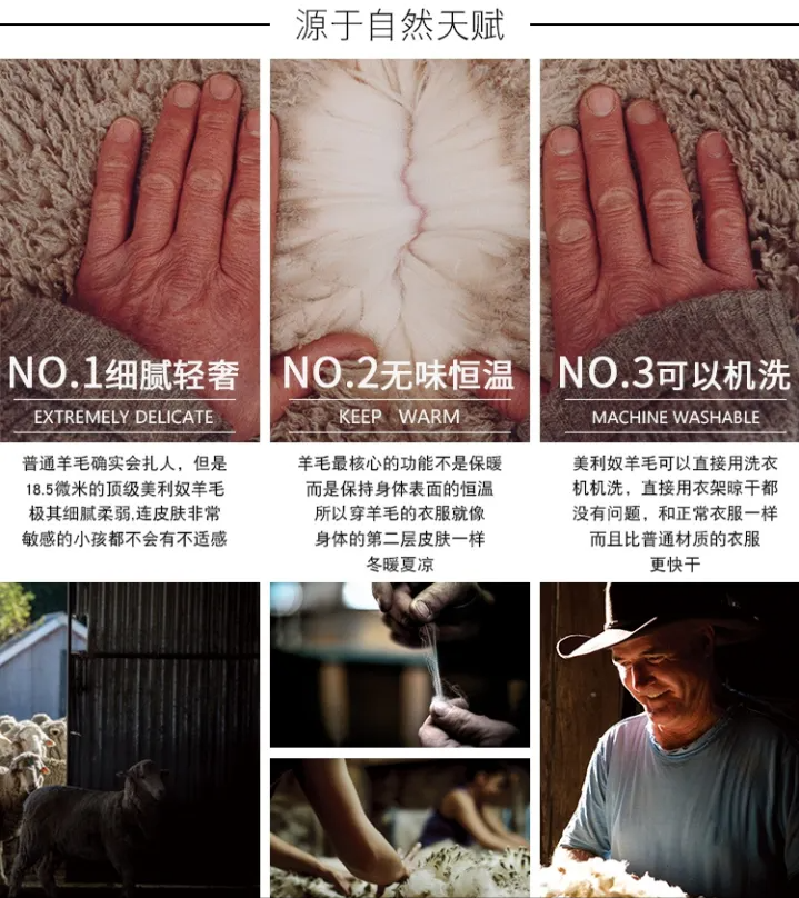 “Merino”美利奴羊毛也稱“美麗諾”羊毛,是所有羊毛品種里,纖細(xì)柔軟的一種,尤其是“直徑不超19.5微米”的超細(xì)羊毛,貼肉穿不扎人。美利奴羊毛卷曲輕盈而有彈性,表面有毛鱗片,可天然抗臭,吸收大量水氣并快速揮發(fā),不捂汗不燥熱,根據(jù)體溫變化產(chǎn)生反應(yīng),一年四季都給人舒適恒溫之感。只要你在面料成份中看到有美利奴,還標(biāo)明羊毛直徑等級,這肯定是靠譜的好東西。