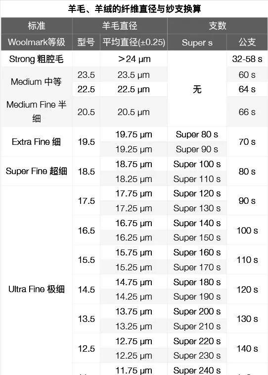 羊毛的支數(shù)和紗線細(xì)度無關(guān),而是和羊毛直徑對應(yīng)。公支是傳統(tǒng)羊毛纖維細(xì)度標(biāo)準(zhǔn),但隨著美利奴羊毛的普及,以國際羊毛紡織組織(IWTO)制定的Super s標(biāo)準(zhǔn)成為主流。