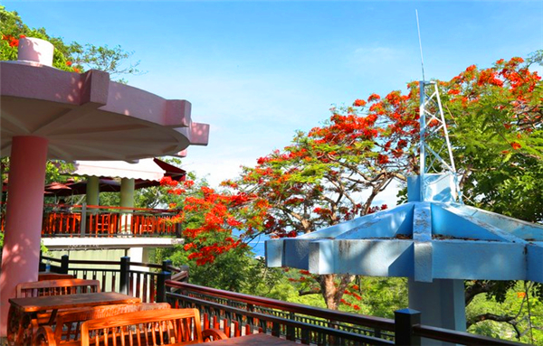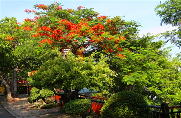 遠(yuǎn)處盛開(kāi)的花朵好像就是木棉花的樣子、空氣中都迷漫著花的香味種植的植物種類也繁多同時(shí)站在上頂上吹著風(fēng)也能夠讓人身心舒暢。