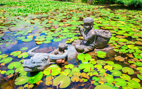 在一個(gè)池塘里看到這個(gè)雕像雕刻的栩栩如生小牧童坐在牛的背上吹著笛子、只可惜池塘里的荷花視乎還沒(méi)有到開(kāi)放的季節(jié)。