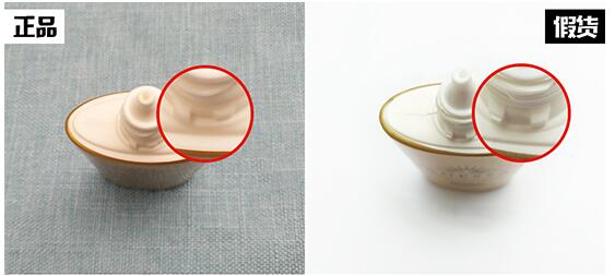 瓶子壓嘴的邊緣,在工藝上制作上會有特別的小細(xì)節(jié):出液孔偏細(xì),假貨出液孔直上直下。