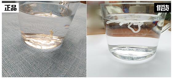 放入水中會沉入水底,而仿冒品的膏體放入水中則會漂浮在水面,可以看出仿冒品的密度是低于水的密度。