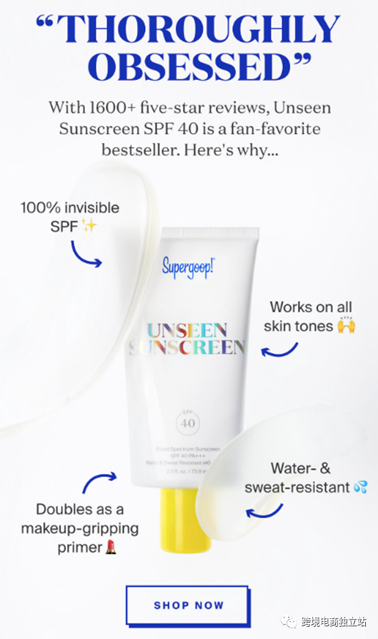 這是一個典型例子。這里的信息微妙但有效:它首先是客戶報價和對看不見的防曬霜的高評分的參考,然后詳細(xì)介紹了該產(chǎn)品的一些主要功能和優(yōu)點: