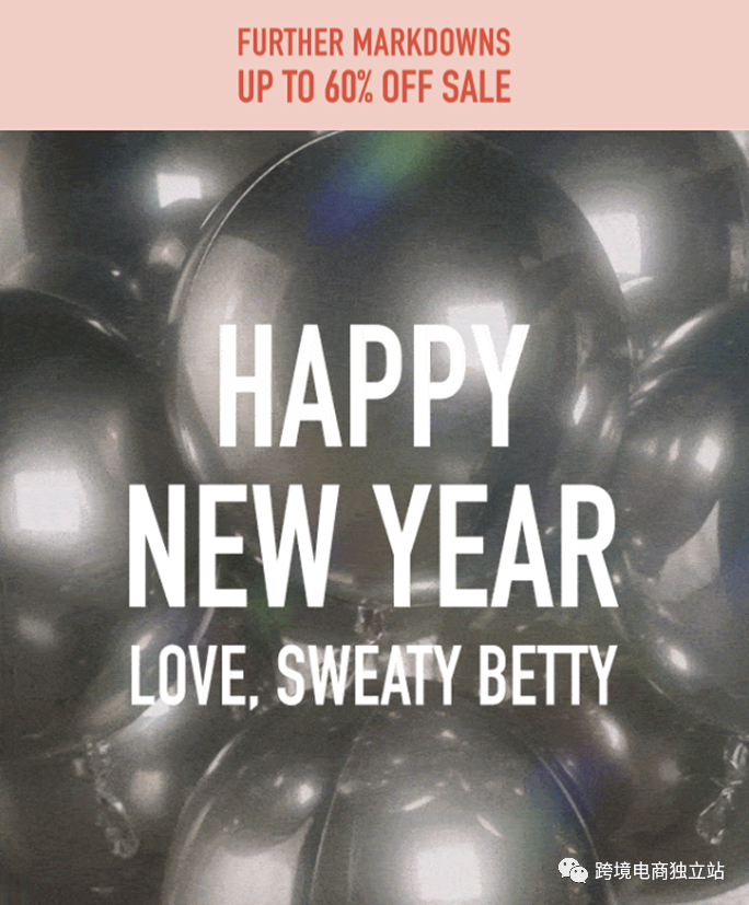 該電子郵件還包含不少于八個CTA,提示讀者購買銷售或瀏覽特定產(chǎn)品類別,客戶在向下滾動頁面時保持購買情緒。Sweaty Betty正確地傳達(dá)了信息。SKUKING跨境電商外貿(mào)建站與運營營銷主任John補充說,一封成功的“新年快樂”郵件還有另一個關(guān)鍵要素:時機。什么時候發(fā)送合適?