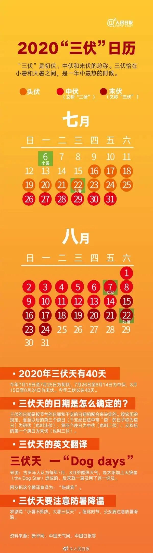 三伏天的持續(xù)時(shí)間是怎么計(jì)算的?三伏是按農(nóng)歷計(jì)算,每年夏至后的第三個(gè)庚日(干支紀(jì)日法中帶“庚”的日子稱為“庚日”)為入伏,立秋后的第二個(gè)庚日為出伏。頭伏和末伏的長度是固定的,均為10天;中伏長度則由立秋節(jié)氣與其后庚日之間的間隔決定。因此,中伏可能是10天,也可能是20天,對應(yīng)的就有30天的“普通版”和40天的“豪華版”。今年碰巧遇到40天的“豪華版”三伏天。