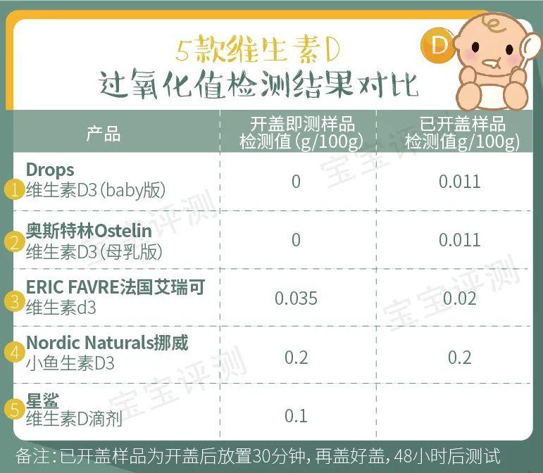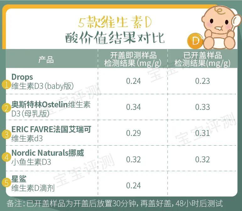 其中,Ddrops是在兩個(gè)指標(biāo)中表現(xiàn)均好的產(chǎn)品。過氧化值開蓋即測數(shù)據(jù)為0g/100g,開蓋后數(shù)據(jù)有極微小變化,為0.011g/100g。酸價(jià)檢測值為0.24mg/g。