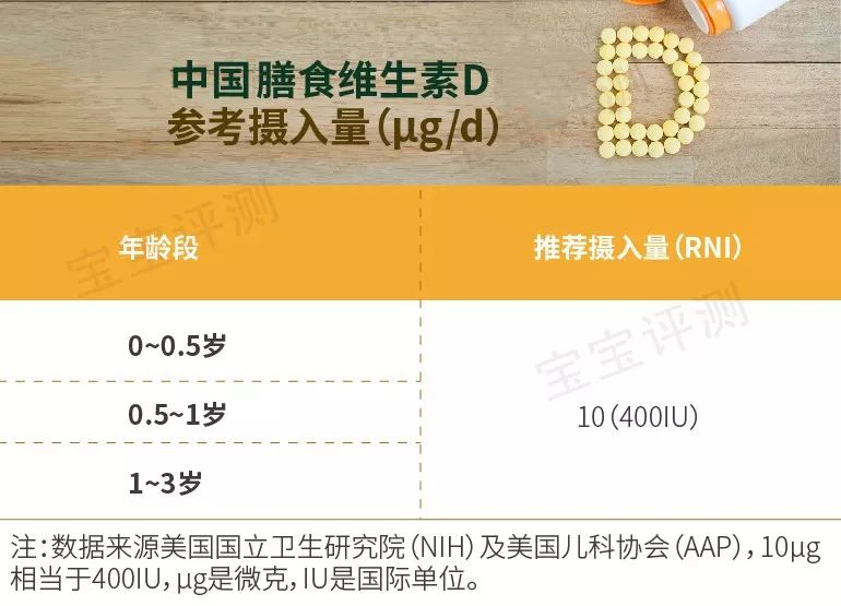 根據(jù)《中國居民膳食營養(yǎng)素參考攝入量(2013年版)》的數(shù)據(jù),0~0.5歲、0.5~1歲、1~3歲這3個(gè)年齡段的寶寶每日都應(yīng)該攝入10微克,也就是400IU的維生素D。