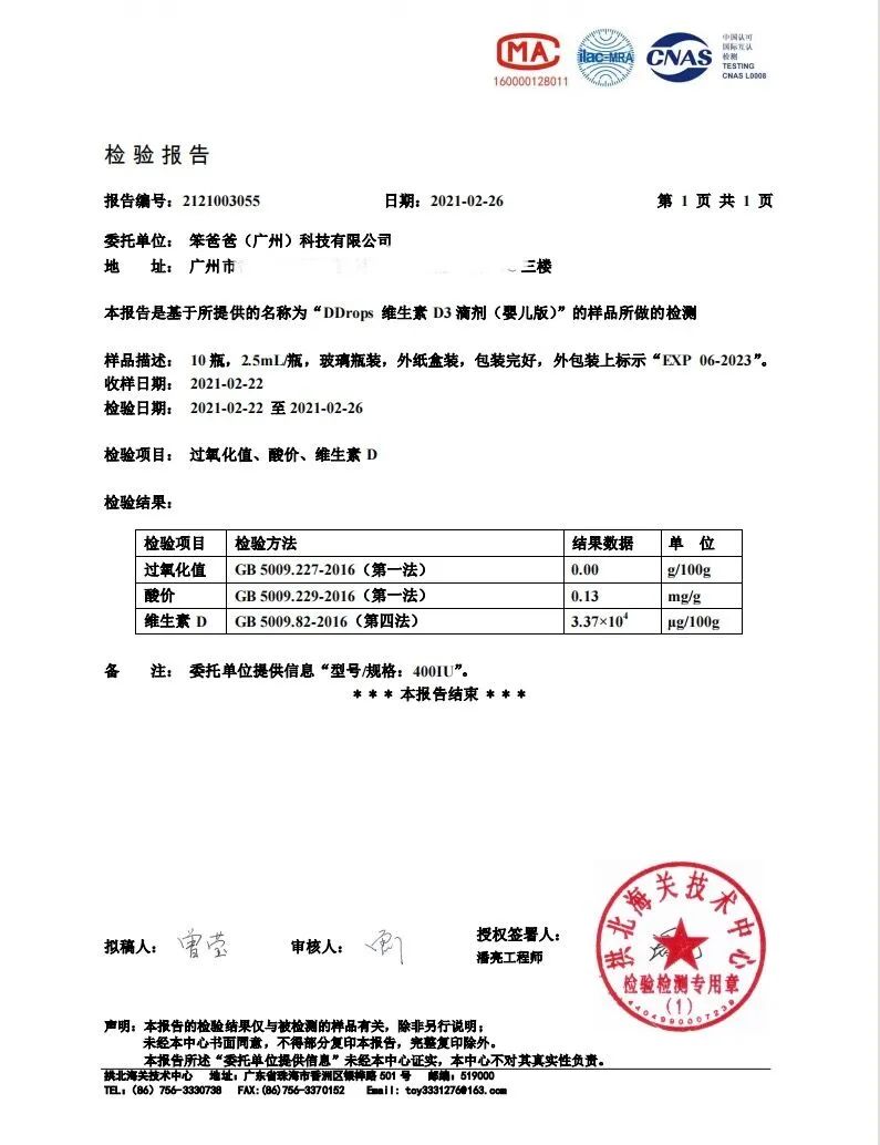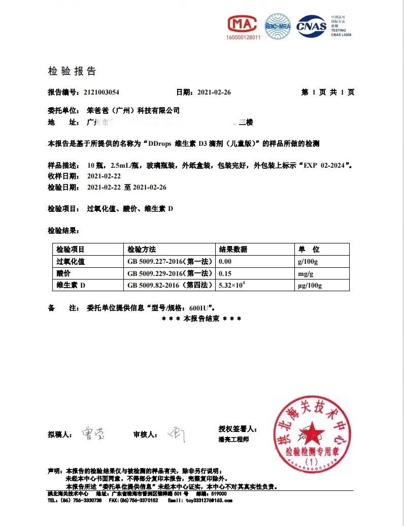 為了驗(yàn)證這款產(chǎn)品品質(zhì)的穩(wěn)定性,2021年2月,笨爸爸又將這款產(chǎn)品重新再進(jìn)行了一次測試,這次既測試了嬰兒版(400IU/滴,2.5ml/瓶,90滴),同時(shí)也測試了其兒童版(600IU/滴,2.8ml/瓶,100滴)。