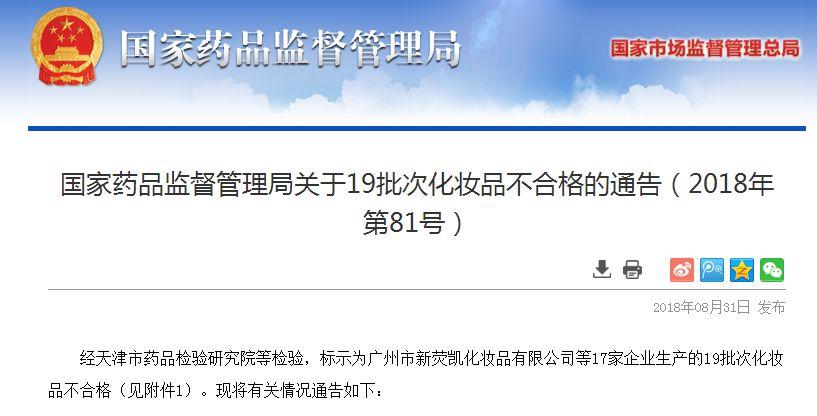 8月31日,藥品監(jiān)督管理局官網(wǎng)發(fā)布關(guān)于19批次化妝品不合格的通告。通告稱,經(jīng)天津市藥品檢驗研究院等檢驗,標(biāo)示為廣州市新熒凱化妝品有限公司等17家企業(yè)生產(chǎn)的19批次化妝品不合格?,F(xiàn)將有關(guān)情況通告如下: