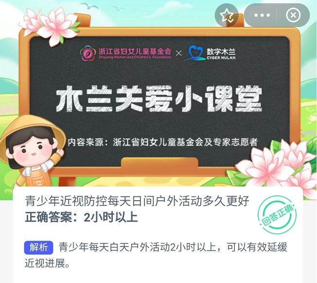 螞蟻新村木蘭關(guān)愛小課堂8月14日問題:青少年近視防控每天日間戶外活動多久更好?
